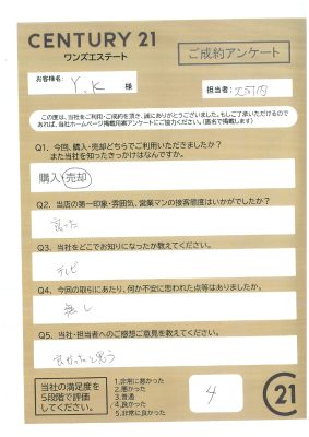 再度ご依頼。マンションは築47年と古かったですがお引渡し前に給湯器の点検、ウォシュレットの交換を売主様でご対応していただき安心して買主様にお引渡しができました。