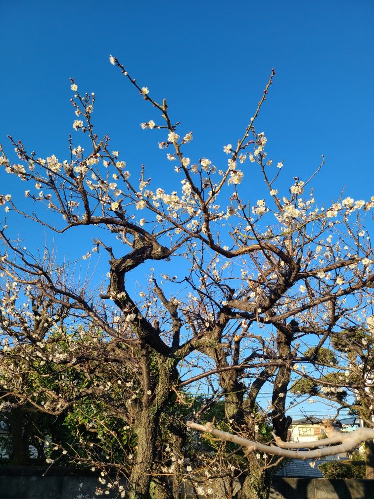 如月を 迎えて開く梅の香が 耐えて忍んで青に溶け行く