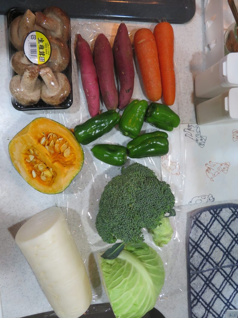 その① まづは野菜…大根、サツマイモ、人参、かぼちゃ、ピーマン、椎茸、キャベツ、ブロッコリーを、任意の大きさに刻み…固い具材から順番に大鍋にポイポイ…