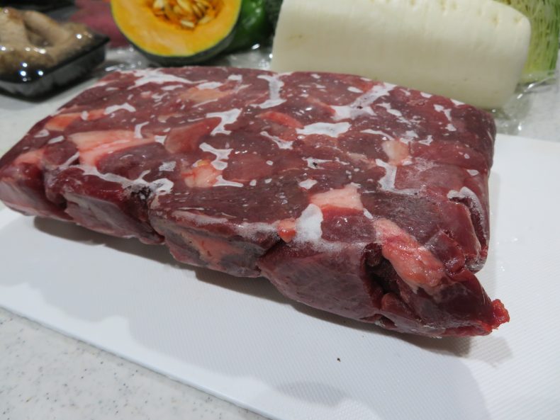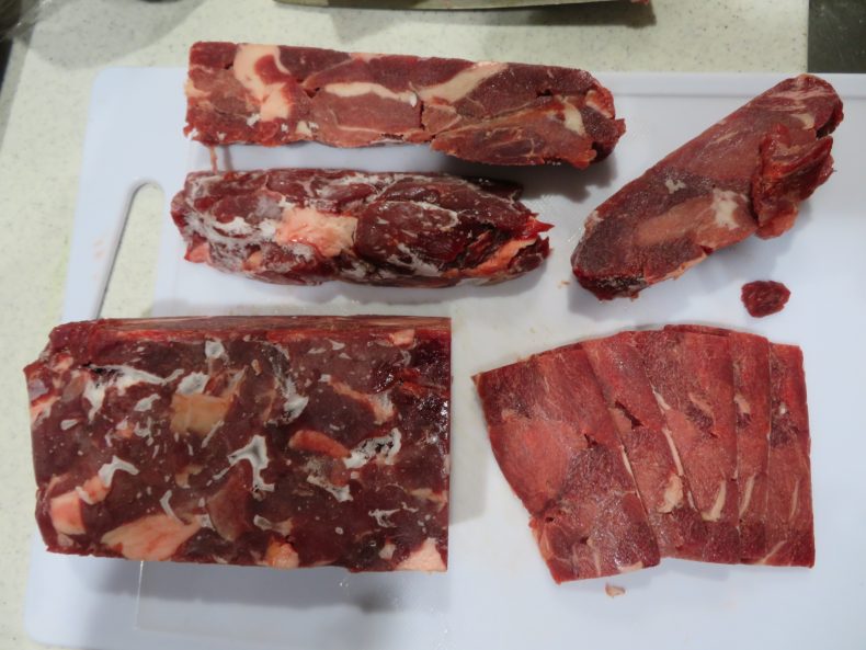 その① 御殿場の武藤精肉店から馬肉の切り落し(すじ肉)、5キロ購入して、約、850グラムに小袋分(6袋)けします…下の写真は、それを一晩冷凍し、早朝に袋だしした状態です…こうすると、形も整うし、切りやすくなりますからね…