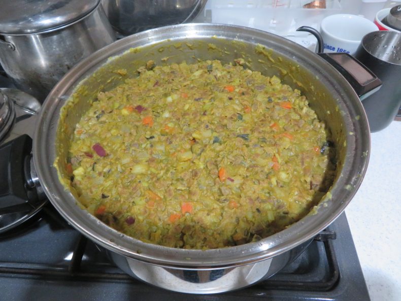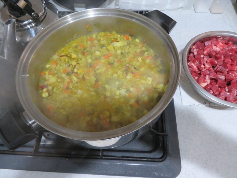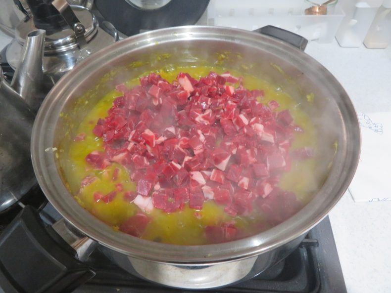 その③ 馬肉を大鍋に放り込んでから、よくよくよ~く、混ぜてから5分ほど追加煮込みます…あまり煮込むと折角のミネラルが無くなってしまうからね…