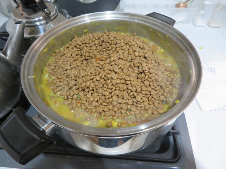 その④ 最後にドッグフードを適量(300グラム)ガバッと入れ込み、混ぜ混ぜ混ぜ…