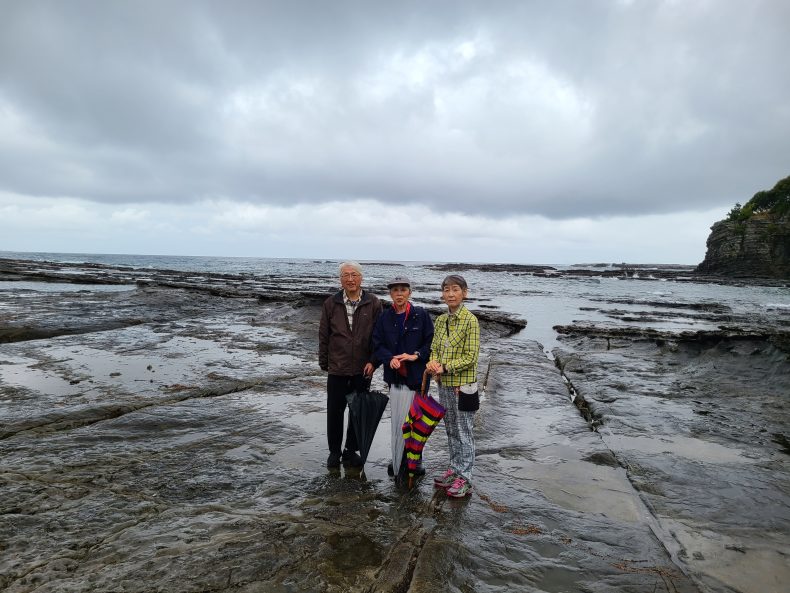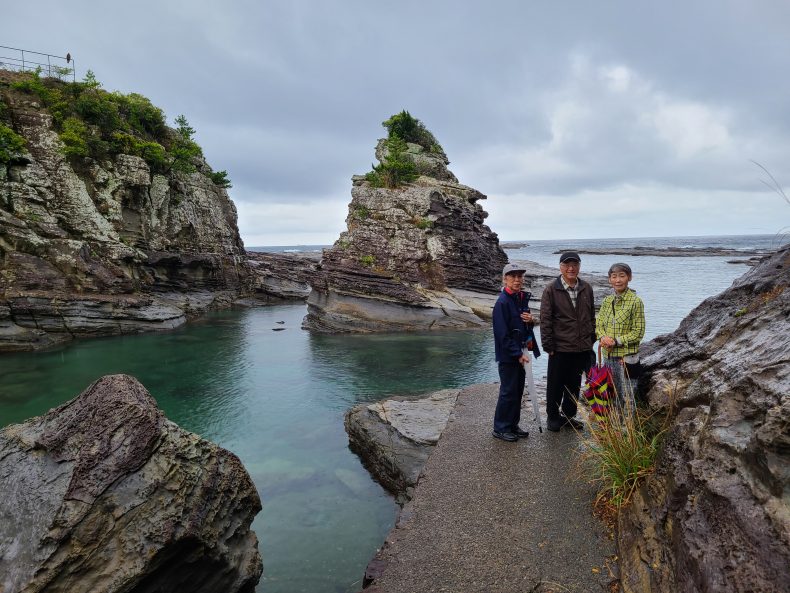 …ということで、「夕海の里」を8時45分に出発し、最初の目的地、「鳥毛洞窟」へと向ったものの、生憎の雨…海岸の岩という岩が滑りやすかったため、大事をとって現地への途中、半分ぐらいで戻ることとあいなりました…とはいえ、そこは大地と大海原の境目…奇岩だらけのそこそこの景観に包まれて一同、まづまづの感動写真…