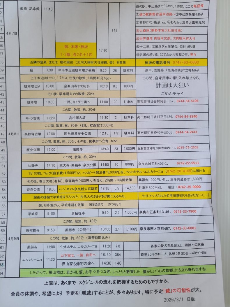 …改めて旅のスケジュールを貼り付けておきましょう…4月7日の、「南方熊楠(みなかたくまぐす)」記念館以降の予定表です…