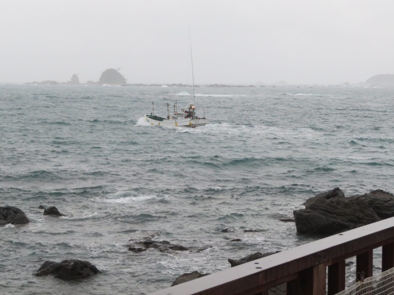 …旅、3日目の朝は、ジャグジーのある宿(夕海の里)の窓からの景色から始まります…今だ明けやらず、勇気ある漁船が、波浪の海に1隻だけ荒波に向けて出港…多くの漁船はこの後、1時間くらい後に出港しておりましたから、漁港にスタート時間の取り決めがあれば…抜け駆けですかね…